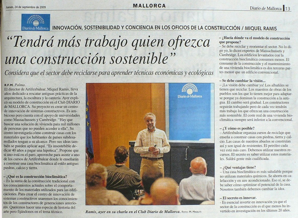 Tras largos años de trabajo callado y riguroso, desde nuestra sede en Palma de Mallorca, ofrecemos un proyecto vanguardista y con vocación internacional que combina construcción tradicional y sostenible, permacultura, tecnología apropiada y arte, una propuesta inédita, mas aún desde unas islas siempre asociadas a la oferta de sol y playa.