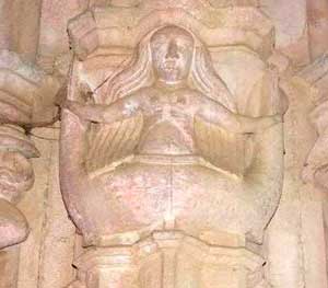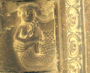Recatada sirena sosteniendo un ramo en la portalada