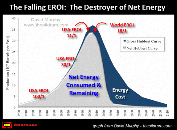 La tasa de retorno energético, ese gran desconocído. El TRE ( EROI en inglés) es la cantidad de energía necesaria para producir...energía o una materia prima. Si el pico del petróleo es deprimente, esperad a analizar el TRE: El precio de combustibles y metales no solo subirá porque habrá menos, sino porque para producir una unidad de energía o de metal hace falta remover y depurar más toneladas de tierra para encontrar una mena de menor calidad. Ergo, doble escalada de precios. Según la Universidad de Nueva York, el TRE mínimo es 3:1.pero si deseamos lujos como sanidad o educación, debe ser mayor. Por ejemplo el biofuel apenas llega al 3:1, con lo que a veces que ser subsidiado con petróleo.La energía fotovoltaica está entre 7:1 y el 10:1 por cierto.